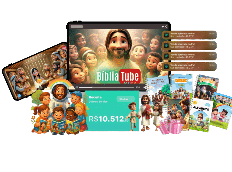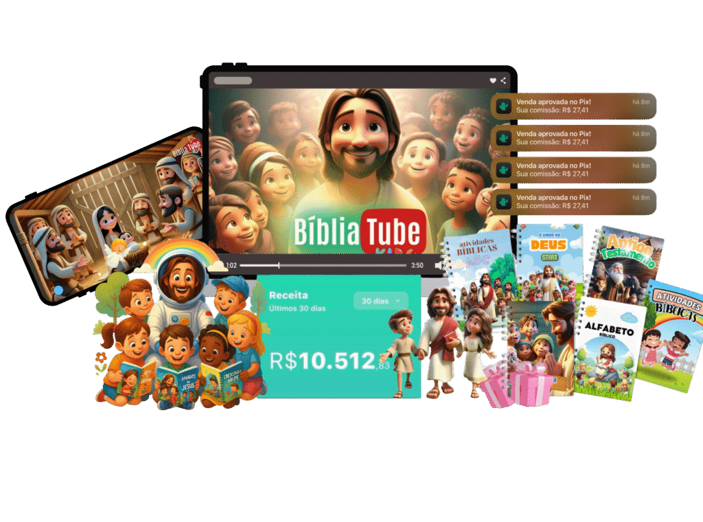 Bíblia Tube, com 14 vídeos e 6 músicas que complementam as histórias para você vender como se fossem seu;